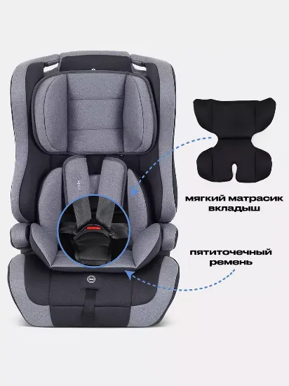 • 5-точечные ремни безопасности не дадут выскользнуть малышу при ударе, а мягкие плечевые накладки подарят дополнительный комфорт и обеспечат надежное прилегание ремней