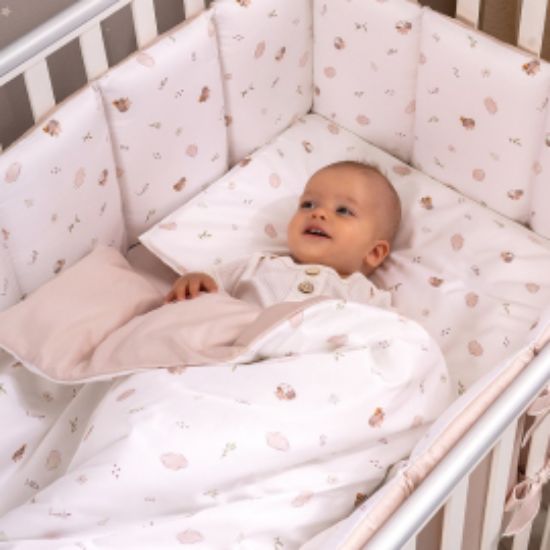 Комплект включает 6 предметов: пододеяльник на молнии, наволочку, простыню на резинке, одеяло, подушку и защитные бортики.