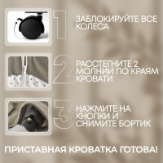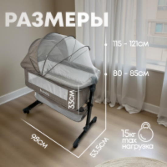 В первые месяцы особенно важно, чтобы ребёнок чувствовал маму рядом. Функция приставной кроватки делает ночное кормление простым и удобным: мама всегда рядом, при этом малыш спит в своей отдельной зоне. Универсальная система крепления и два уровня регулировки высоты позволяют подстроить модель под любую родительскую кровать.