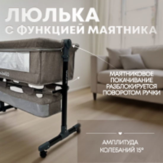 • Маятниковое качание снимается с блокировки поворотом ручки: амплитуда 15° создаёт плавные и бесшумные движения, которые помогают малышу быстрее засыпать.