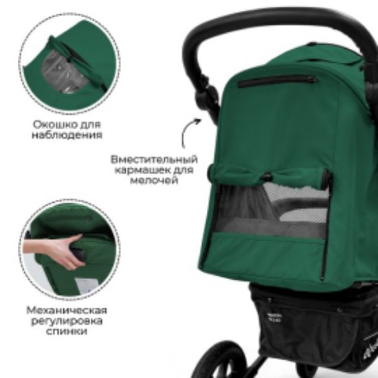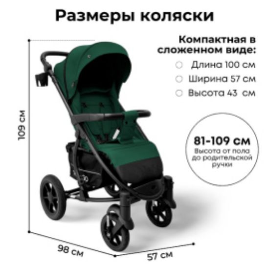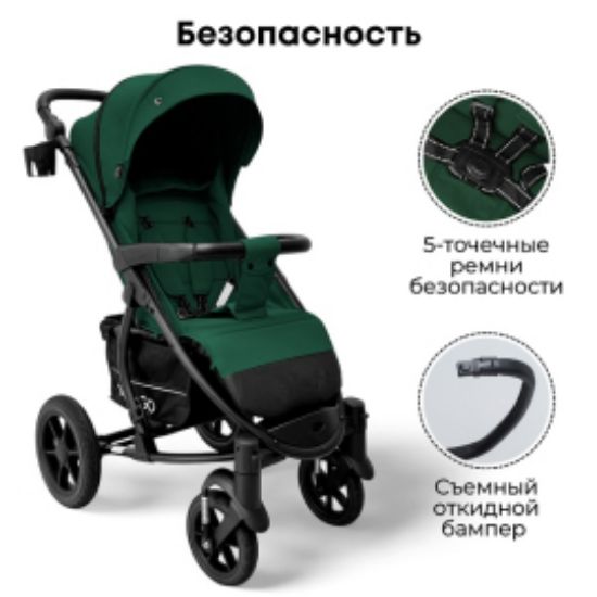 Коляска оснащена усиленной рамой и крупными колесами, обеспечивающими уверенное движение по любым поверхностям.